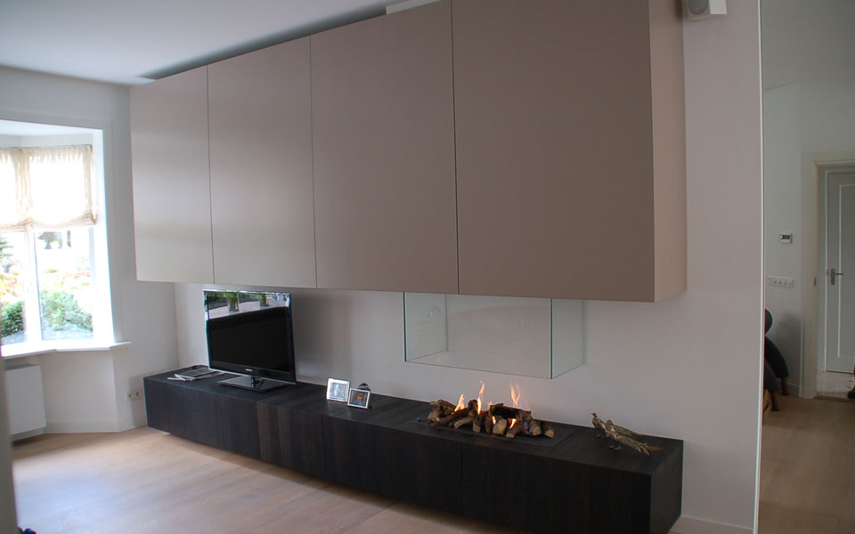 woonkamer kast met 4 grote kasten hangend aan de wand. Voorzien van mdf handgeschilderde deuren. Buitenste deuren gemaakt met een verstek aan draaizijde deur.